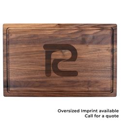 This 11" x 17" x 3/4" walnut cutting board is perfect for laser engraving a logo, name or monogram, this makes an ideal promotional product, corporate gift or wedding present. Equipped with a juice groove, this board will prevent liquids from reaching your counter, making cleaning more simple and efficient. Oversized imprint is available. Logo will engrave in a natural wood color.